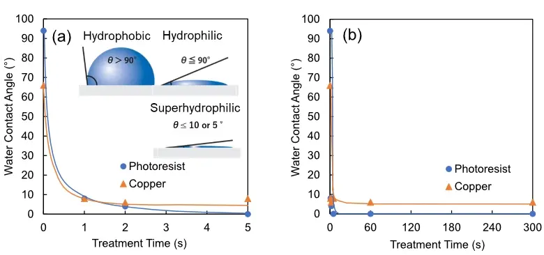 The contact angle measurement results are shown in Figure 2. The photoresist was initially hydrophobic with an initial value of 94°, but after 1 second of treatment it became super hydrophilic with a value of 8°, and further treatment from 5 to 300 seconds resulted in a contact angle of 1°. Seed Cu had an initial value of 66°, but was super hydrophilic to 8° after 1 to 300 seconds of treatment.
