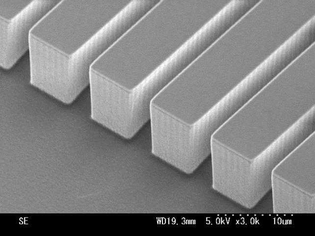 Microfluidic channels with a width of 3 μm were fabricated using the Bosch process on the RIE-400iPB system. This vertical deep etching method ensures precise control over channel geometry, making it ideal for lab-on-a-chip applications and biomedical research.