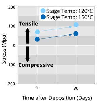 SiO₂ films deposited at 120–150°C show minimal stress variation even after 30 days, making them ideal for TSV passivation in thinned wafers.