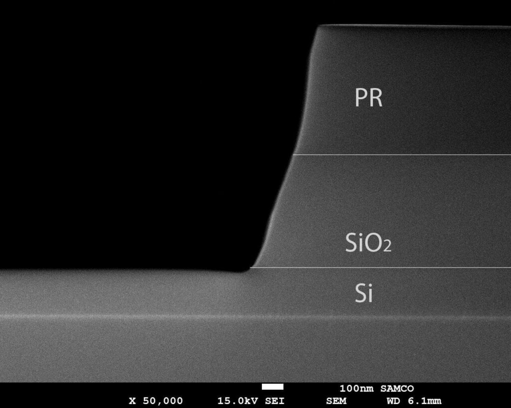 Trench etching of SiO2 was performed using the RIE-10NR system, achieving an etch depth of 540 nm with a rate of 18 nm/min. The selectivity to the resist mask ranged from 0.8 to 1.0, maintaining the resist sidewall angle and preventing microtrenching. Time-controlled etching stops enabled precise etching of SiO2 with minimal impact on the underlying Si layer.